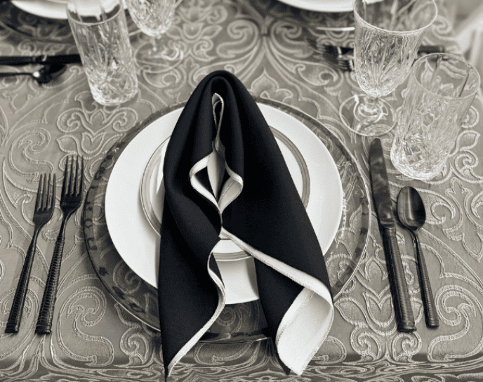 Greta Dinner & Salad Plates, Black Vivi Flatware, Poly Poplin Napkin, Melodia AP & Champagne Glasses