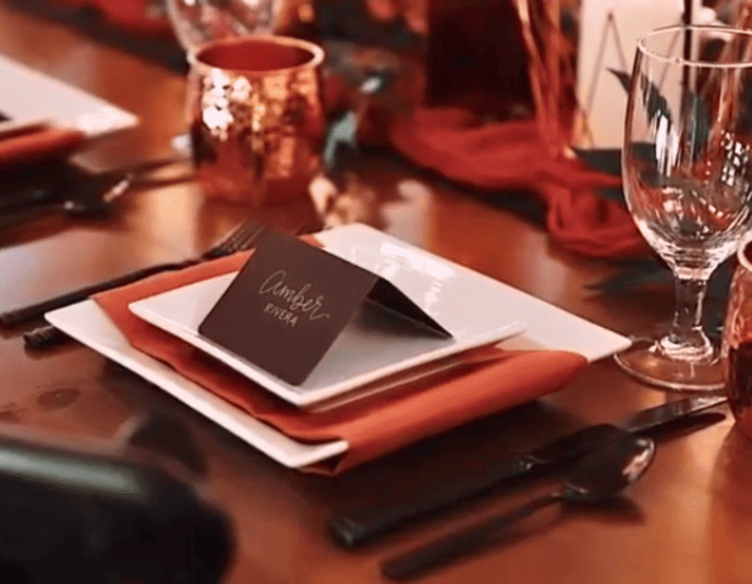 Square Dinner & Salad Plates, Black Vivi Flatware, Poly Poplin Napkin, 14oz AP Glass, & Copper Mug