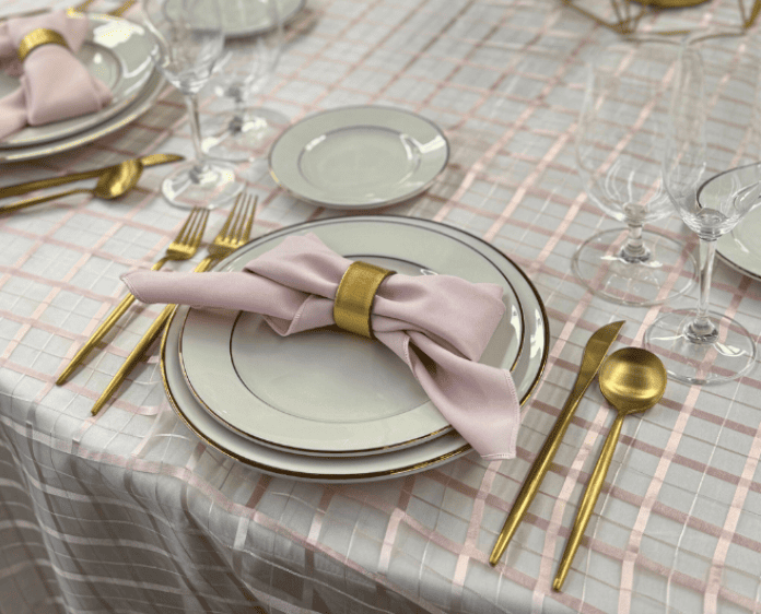 Greta Dinner Plate, Gold Savoy Flatware, Poly Poplin Napkin, & Melodia Hi-Ball Glass