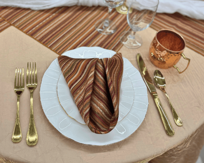 Greta Dinner & Salad Plates, Gold Savoy Flatware, Cornucopia Napkin, Copper Mug, 14oz AP & 12oz Wine Glasses