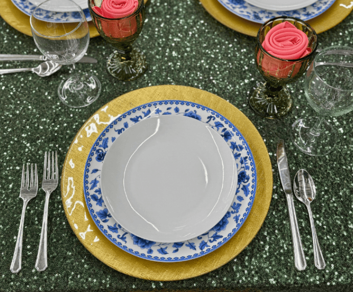 Gold Glass Gharger, Savannah Dinner Plate, Coupe Salad Plate, Silver-plated Flatware, Poly Poplin Napkin, Green Emma Goblet & 12oz Wine Glasse